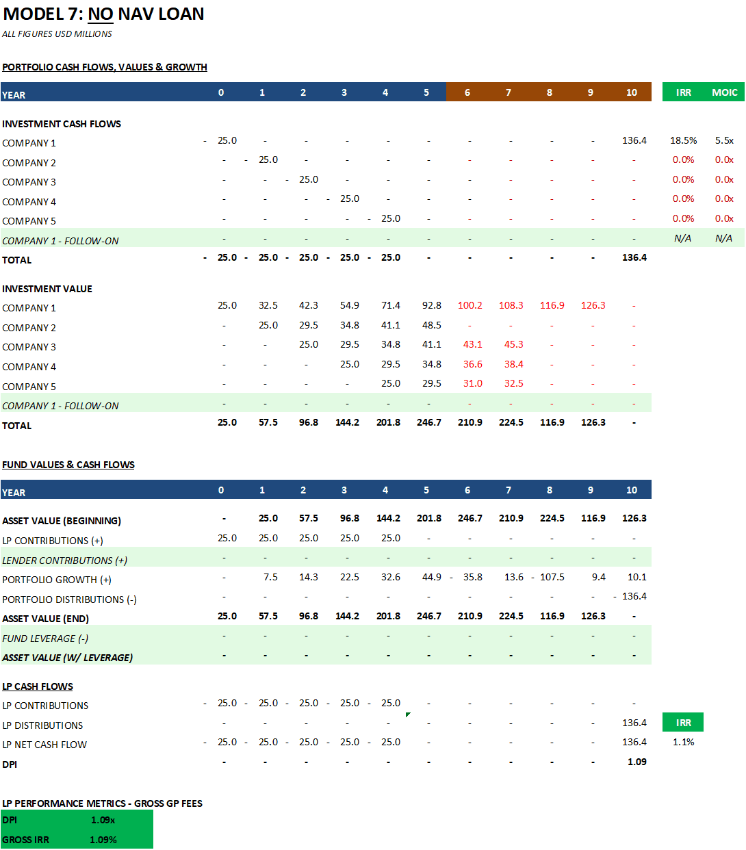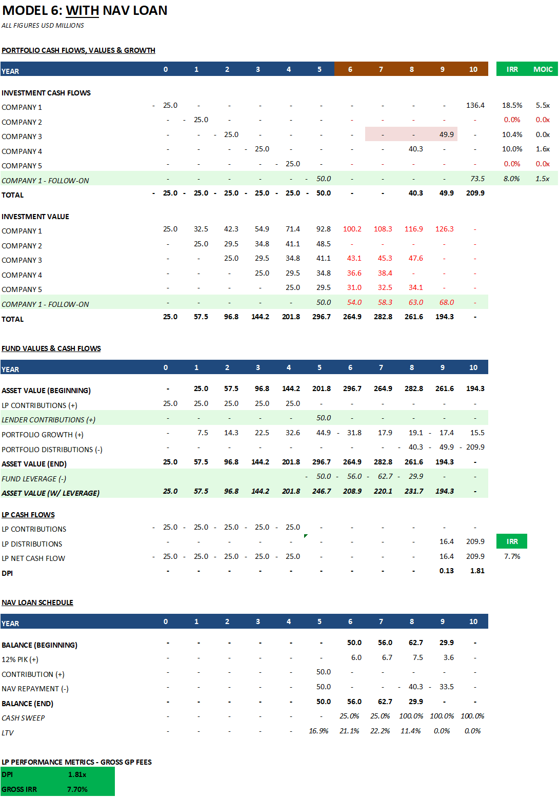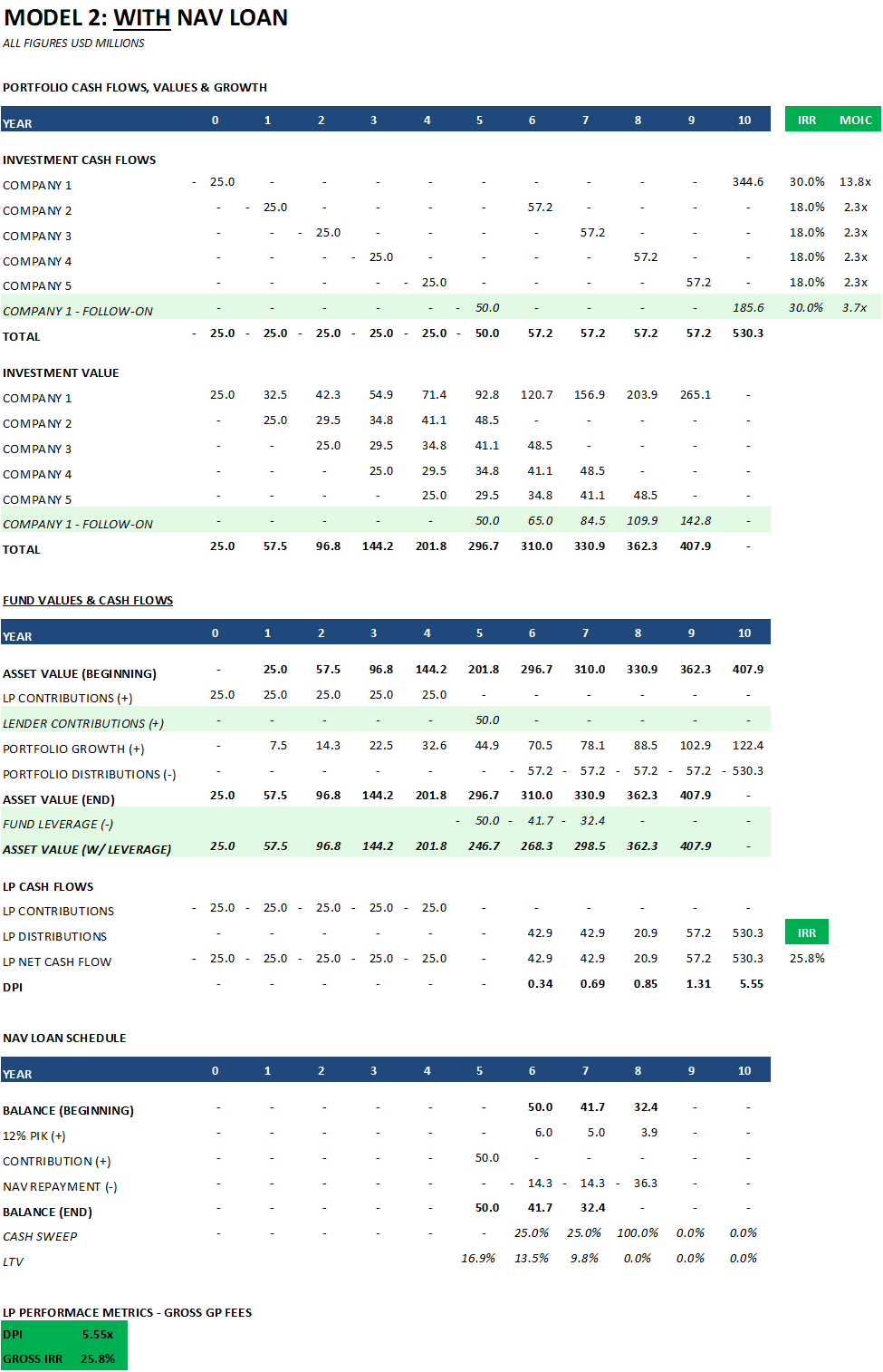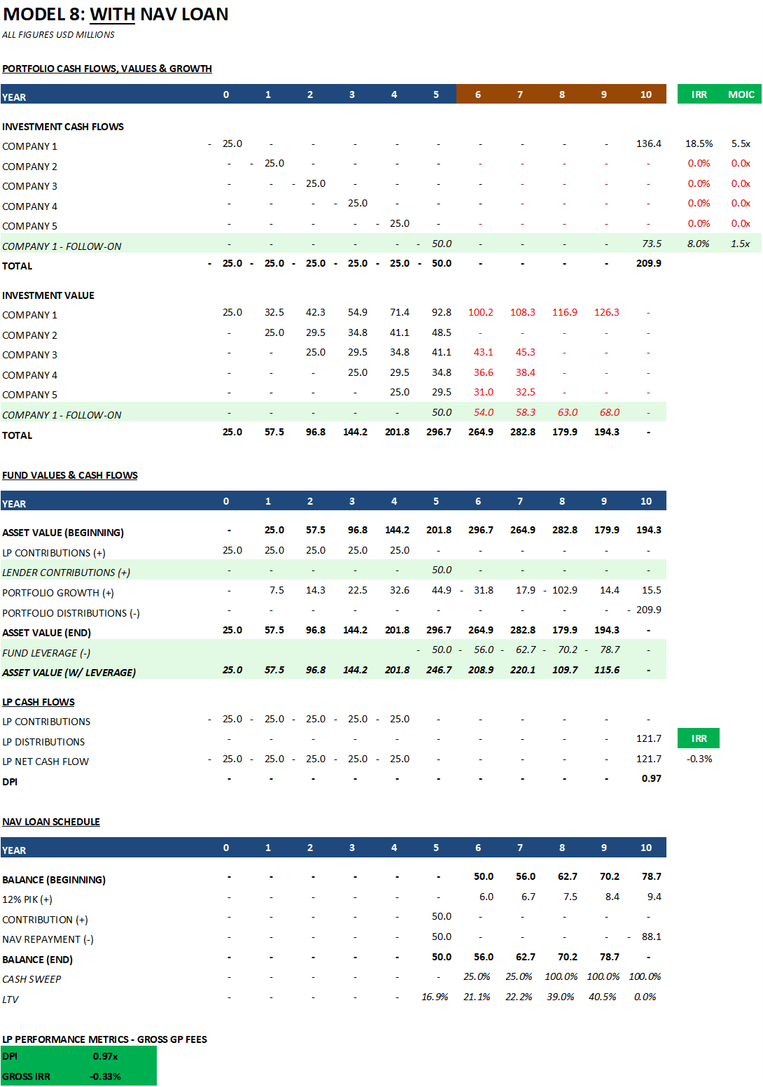 This analysis ignores the legal consequences of triggering covenants, which can be significant. We will cover these in Part 3. However, as you read, keep the following in mind. If an LTV covenant (e.g., 2x starting LTV) or a time-based covenant (5yrs) is triggered, there are typically a few options after a cure period: refinancing or extending the facility. Eventually, a forced asset sale could be the fallback. GP capital contributions or LP recall are theoretically possible but rare and contentious. Some LPA provisions allow the GP to recall previously distributed capital, but exercising this right damages LP relationships and is seen as a last resort. The practical reality is that NAV lenders also don't want to foreclose on a portfolio - they'd end up owning minority stakes in private companies they have no ability to manage. This is why the cash sweep mechanism in the model matters so much - it amortises the loan using interim portfolio exits, reducing the risk of a large balloon payment at maturity.