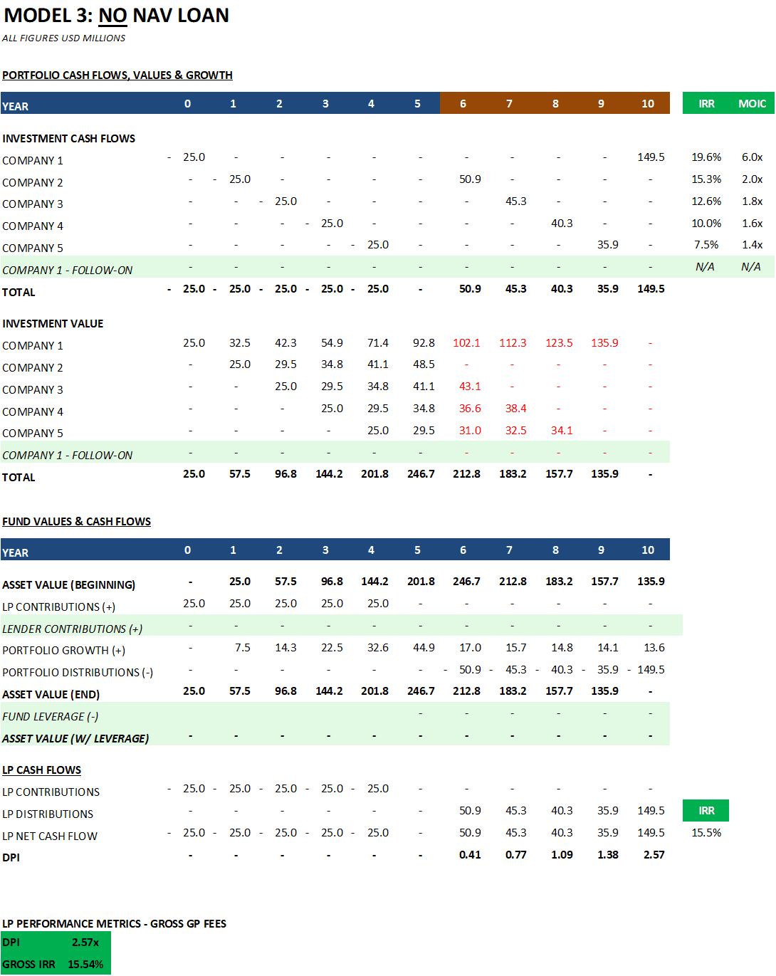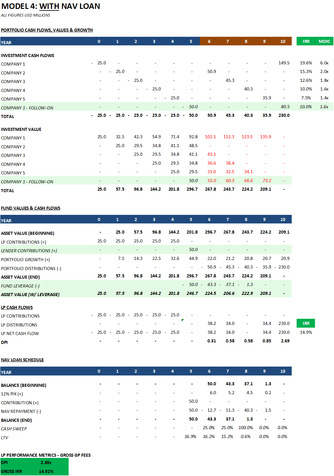 Portfolio Company Values: Details the timing of investments and divestments, company valuations over time, and growth rates. Investment cash flows, multiples, and timing align with the aforementioned portfolio metrics.