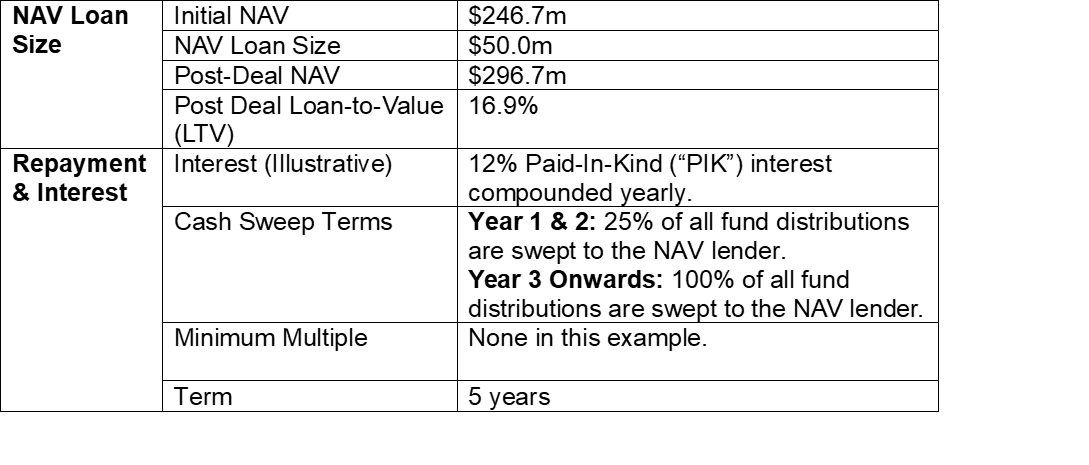 NAV Loan Terms (Illustrative) are the same for each scenario