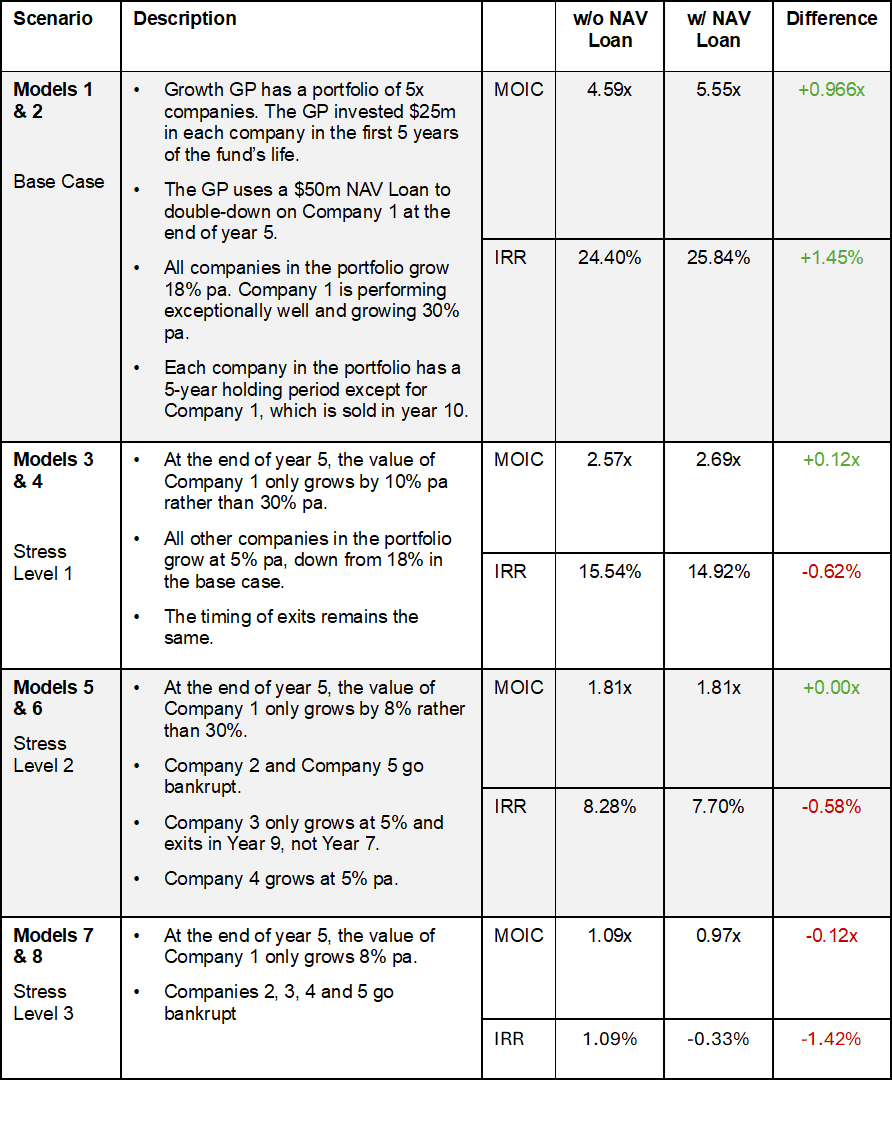 In Part 2, we run four scenarios focused on returns, with and without NAV facilities, across varying levels of stress. The goal of this series is for LPs and GPs to understand upside and downside scenarios. Part 3 will go deeper into structures/terms.