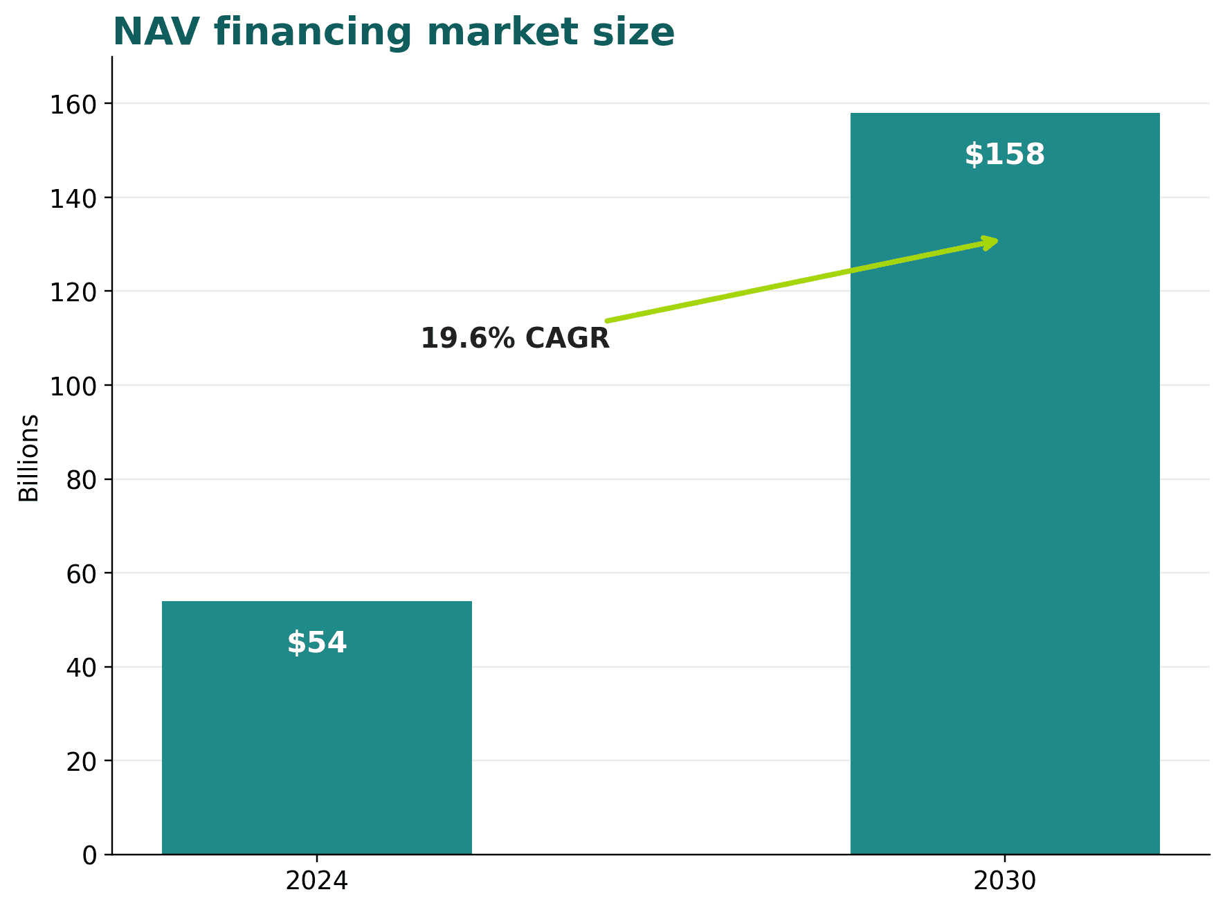 In the recreated market-size illustration, the market expands from $54 billion in 2024 to $158 billion by 2030, implying growth of just under 20 per cent per year. Those figures have been adjusted from the original source, but the strategic point remains the same: NAV finance still has significant room to scale if private markets continue to face slower exits, selective capital formation, and a need for more flexible portfolio-level solutions.