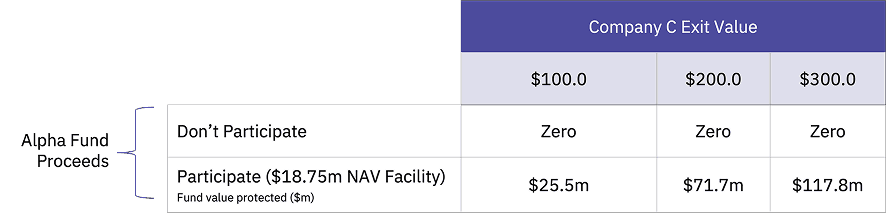 Decision-making table showing the proceeds to Alpha Fund 1 from Company C at a $100m, $200m and $300m (expected) valuation.